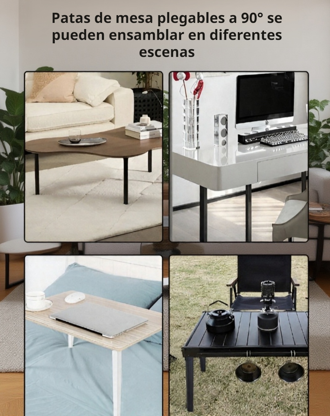 ● Mesa plegable de diseño innovador con patas de soporte abatibles a 90°, ideal para ahorrar espacio en hogares y oficinas sin perder estabilidad.