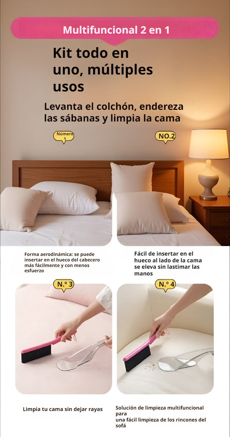● Innovador diseño 2 en 1 que combina elevador y cepillo de cama, facilitando la limpieza y el mantenimiento con un solo producto práctico. ● Operación con una sola mano que permite ahorrar tiempo y esfuerzo, ideal para personas ocupadas o con movilidad limitada. ● Materiales de alta calidad que garantizan durabilidad y un uso cómodo, cuidando tanto de tu colchón como de tu bienestar. ● Elimina eficazmente polvo, pelos y ácaros, proporcionando un entorno más higiénico y saludable para toda la familia. ● Compacto y fácil de almacenar, perfecto para cualquier hogar sin ocupar espacio innecesario.